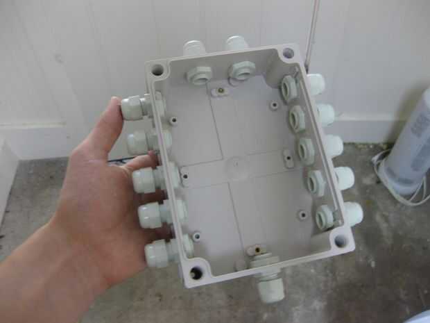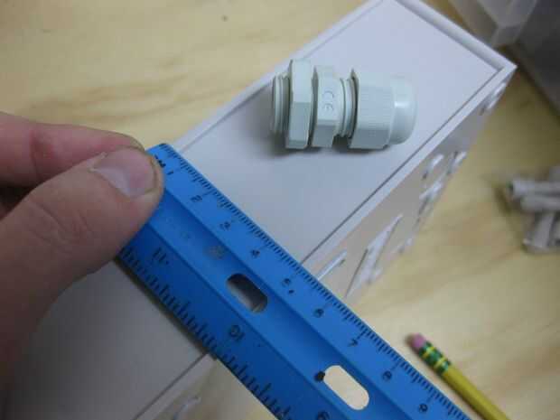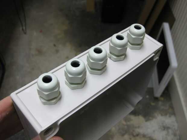 Las glándulas de cable exterior tenían una tuerca en el interior que funcionó en uno de los postes de soporte de la caja. Sólo corte parte de la parte exterior de la tuerca para que se ajuste – no debe comprometer el sello demasiado mal, y la caja debe sobrevivir salpicaduras de la lluvia bien (esperemos que esta cosa no terminar completamente bajo el agua!).