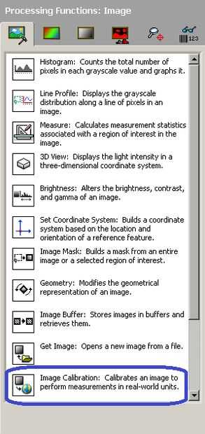 Debe crear una secuencia de comandos en el programa. Esto es básicamente una versión muy simplificada de la codificación. Primero hay que calibrar la imagen y dar al programa una tasa de conversión de pixeles a micrómetros. Para ello pulsando la opción "Imagen de calibración" en el menú de la izquierda.
