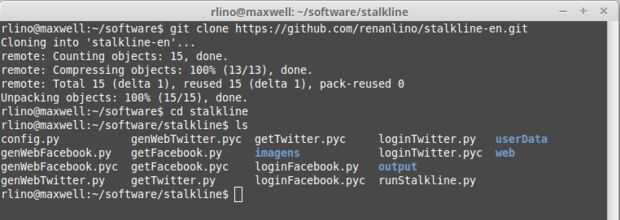 Elegir instalar Stalkline archivos de un directorio (/ home/su_nombre_de_usuario/o/home/root/funciona bien) y el tipo git clone https://github.com/renanlino/stalkline-en.git. Git copia los archivos de origen de mi repositorio de GitHub en la carpeta stalkline dentro de su directorio de trabajo.