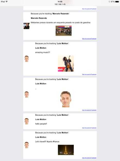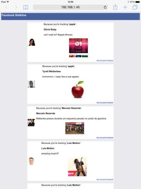 Después de la instalación inicial, basta con ejecutar sudo python -W ignorar runStalkline.py. Stalkline obtendrá su feed de noticias de Facebook/Twitter, temas de búsqueda seleccionada y los usuarios y generar un archivo HTML simple, almacenado en la carpeta /var/www/var/www que es visible desde cualquier ordenador en la misma red.