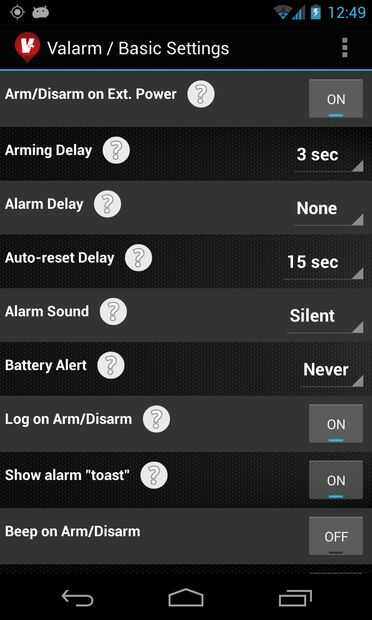 Bajo configuración básica tienes opciones para una cuenta regresiva de activación, mensajes emergentes, sonidos de alarma y más. El armar y desarmar en la opción de alimentación externa que se armará automáticamente Valarm cuando el dispositivo está conectado a una fuente de alimentación es importante tener en cuenta en esta página. Es común utilizar este vehículo de seguimiento con un cargador de coche. De esta manera Valarm será sólo informe y registro de datos cuando el vehículo esté encendido. En la imagen de abajo puede ver esta opción habilitada.