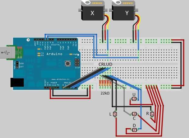 -Los servos están próximos. Los cables que vienen desde el servo variará dependiendo marca y modelo, pero es generalmente seguro asumir el rojo es energía, el negro es tierra, y el alambre que queda es la señal. El pin central, lo que sé, siempre es el poder. El cable de señal puede ser blanco, gris, naranja y amarillo. A veces habrá 2 cables negros y uno gris. El único cable es la señal, el medio es el poder, y el otro es la tierra. Los servos van a fuente de, tierra, y los cables de señal van en pins 11(for x values) y 10 (para valores de y).
