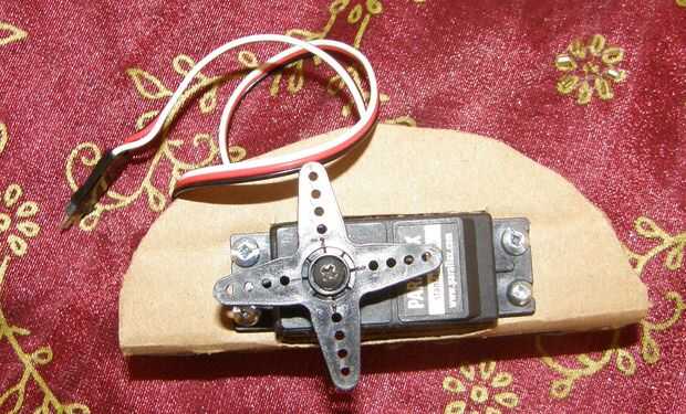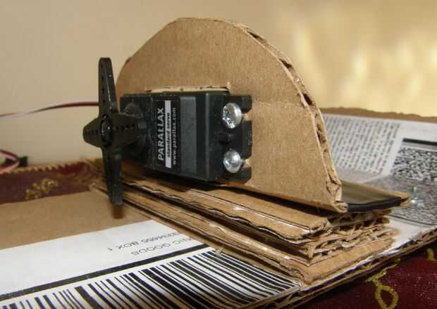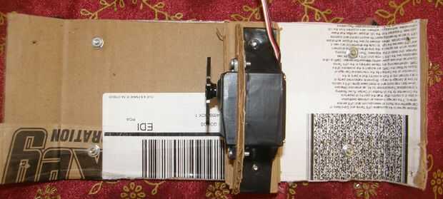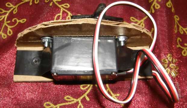 Todo que hizo fue amurado a una pieza cuadrada de cartón aproximadamente dos veces el tamaño del servo y corte general en el centro poner la parte inferior del servo a través de. Después de eso, corté una tira delgada de cartón para permitir que se curva suavemente más como en la foto. Esto mantiene mi servo en su lugar y me dio una superficie para atornillar la abrazadera con.
