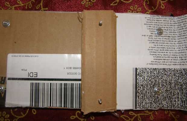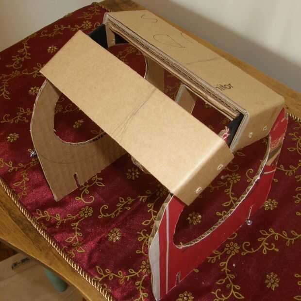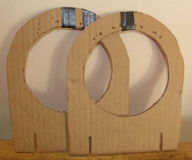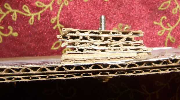 Una vez, se necesita cierta estabilidad en las piernas. Cortar dos trozos de cartulina de aproximadamente una pulgada más grande que el ancho de la caja (esto incluye el flappies para poner los tornillos a través de). Como con el anterior soporte, coloque una o dos rebanadas extras de cartón a éstos para proporcionar fuerza, se necesitan más de todo, ya que va a utilizar estos para soportar el peso del casco. Las llaves deben colocarse cerca de la cima como sea posible, de lo contrario limitar el rango de movimiento de su suntracker.