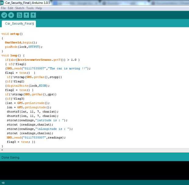 #include <OneSheeld.h> char* gps = "gps"; char* stopp = "stop"; float lat ; float lon ; int lock = 12; char charlat [12]; char charlon [12]; char readings [80]; boolean flag1 = false; boolean flag2 = false; boolean flag3 = false; void setup() { OneSheeld.begin(); pinMode(lock,OUTPUT); } void loop() { if(abs(AccelerometerSensor.getY()) > 1.5 ) { if(!flag1) { SMS.send("01004078579","The car is moving !!"); flag1 = true; } } if(!strcmp(SMS.getSms(),stopp)) { if(!flag2) { digitalWrite(lock,HIGH); flag2 = true; } } if(!strcmp(SMS.getSms(),gps)) { if(!flag3) { lat = GPS.getLatitude(); lon = GPS.getLongitude(); dtostrf(lat, 11, 7, charlat); dtostrf(lon, 11, 7, charlon); strcat(readings,"latitude is : "); strcat (readings,charlat); strcat(readings,"\nLongitude is : "); strcat (readings,charlon); SMS.send("01004078579",readings); flag3 = true; } } }