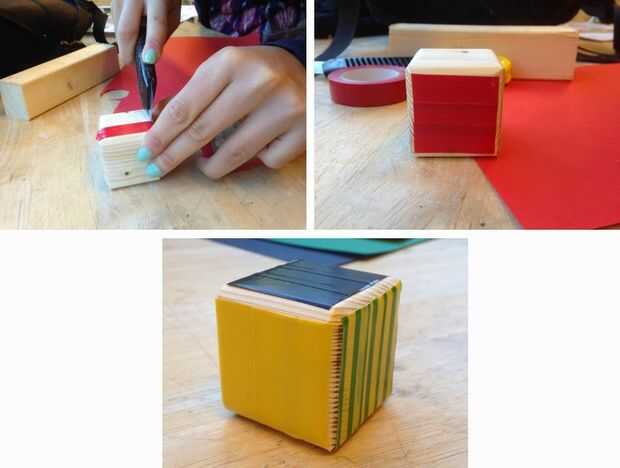 Tome la cinta y cinta de un lado del cubo. Repita para todos los lados con un color diferente.
