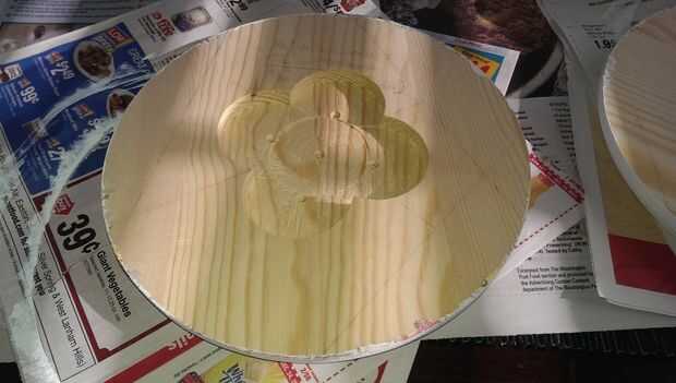 Basado en el material que se utiliza como una base de reloj, puede que necesite hacer el cuerpo más delgado en el centro para acomodar el movimiento del reloj. El movimiento que compré tenía un grosor máximo de la esfera de 1/4", lo que significa que necesitaba madera que fue menos de 1/4" la parte del tornillo a través de la cara y todavía tienes espacio para colocar la tuerca hexagonal. Puesto que la placa que compré era más gruesa que esto, necesitaba utilizar una pieza Forstner o un enrutador para cortar un agujero parcialmente en la parte posterior del reloj como se muestra en la imagen. En mi caso, usé un poco forstner para hacer varios cortes redondeos en madera que finalmente me dio un espacio lo suficientemente grande como para caber el movimiento del reloj. Si vas con una pieza más delgada de madera, no dude de omitir este paso.
