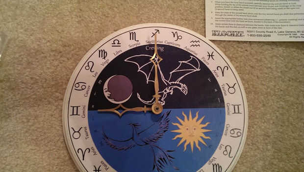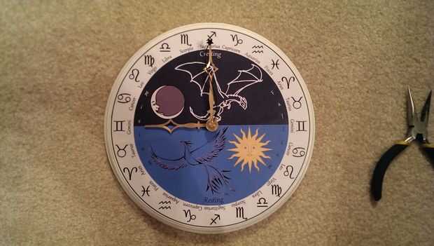 Empujar el movimiento del reloj a través de la cara desde la parte trasera como en las instrucciones, alinear el soporte con la parte superior del reloj. En la parte delantera, utilice alicates de punta delgada para apretar la tuerca hexagonal en la cara hasta que ya no gira el movimiento de reloj. Seguir las instrucciones para ensamblar las manos y por último, en una batería y colgar el reloj en la pared. Ahora su casa es un poco más mágica.