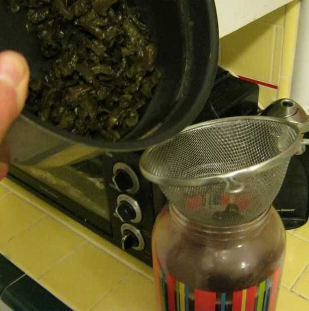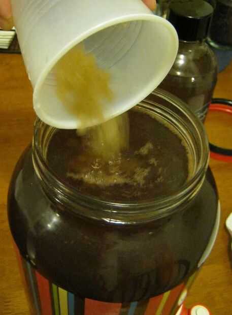 Cuando todo se haya enfriado, la jarra ha sido lavada con agua y ha sido recompuesta, vierta el té tibio en la jarra. Use un colador para recoger hojas de té. Por último, añadir el kombucha o kefir de agua y dejar fermentar. Debería estar listo en 3 días a 1 semana dependiendo del tamaño, el azúcar y la temperatura.