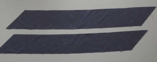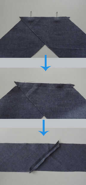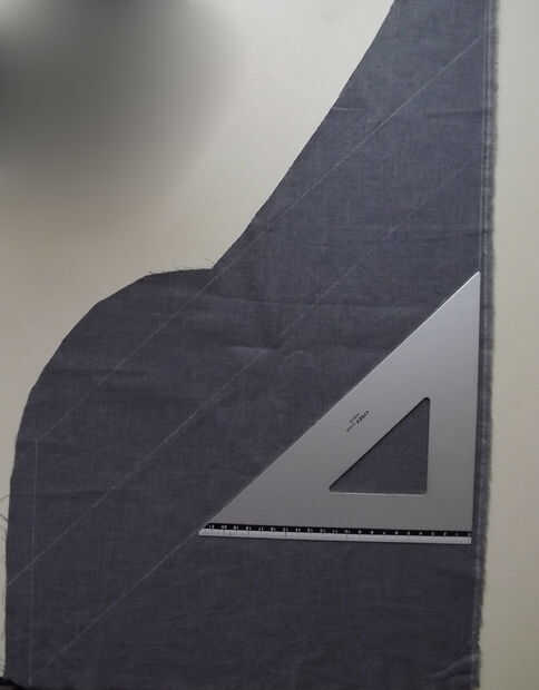 Utilizando el sorteo de regla triangular una línea en la tela de 45 grados contra la línea de grano. Esto hará que la cinta de ajuste mejor el sombrero. Yo no tenía suficiente tela, así que tuve que dibujar dos cintas, que cose juntos más adelante.
