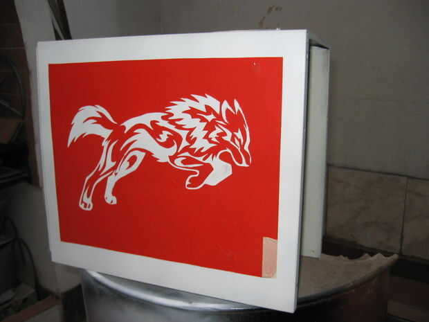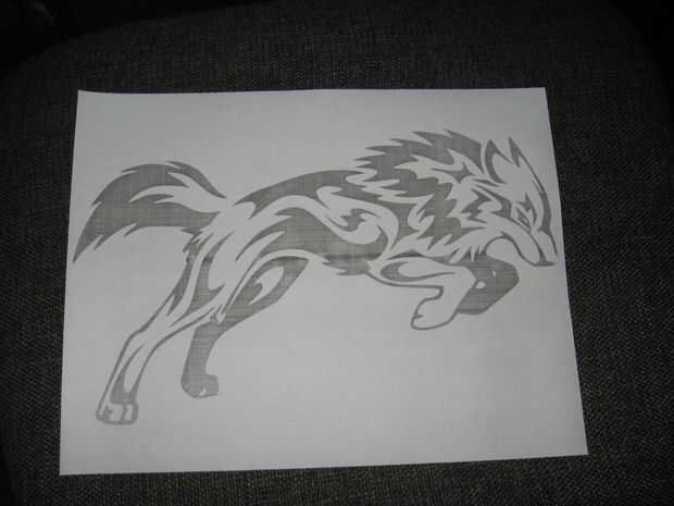 Con la cubierta de la caja ya pintada puse el papel de contacto en uno de sus lados y un papel impreso copia del diseño tribal de lobo para cortar la plantilla con un cuchillo x-acto (Aquí encontré que esto no es fácil, por cierto fue mi primer momento hacerlo, por lo tanto necesitaba mucha paciencia). El primer intento fue un fiasco y tuve que empezar otra vez la punta de prueba segundo a mejores resultados