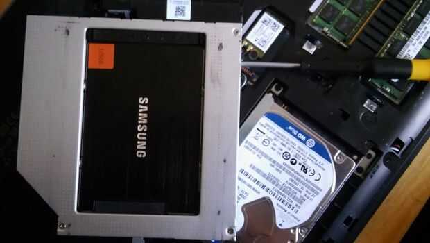 Me gusta tener el coche más rápido (en el que está instalado mi sistema operativo (windows)) (SSD) en el lugar que el disco duro fue cuando compré mi portátil, pero mi disco duro era demasiado espesa para mi carrito, así que puse mi SSD en él.