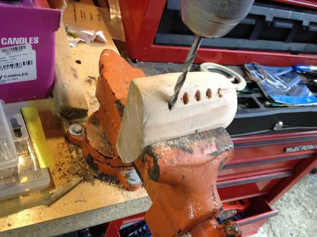 Puse el bloque formado en el vicio y trazado de los agujeros para los cordones. Pongo en 6 agujeros (sólo se muestran) 1/2 pulgada aparte. Esto es donde usas el pedacito de taladro de 7/32. Hice esto gratis tenía demasiado, pero sería mucho mejor en una prensa del taladro. No tienes hacer directamente a través de. Sólo tienes que perforar el canal que se corta.