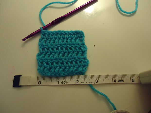 Usar la cinta métrica para saber cuándo ha llegado a una plaza. Mina terminó aproximadamente 2 3/4" de largo. Para mí se trataba de 6 filas. Esto puede ser diferente según el gancho de hilo.