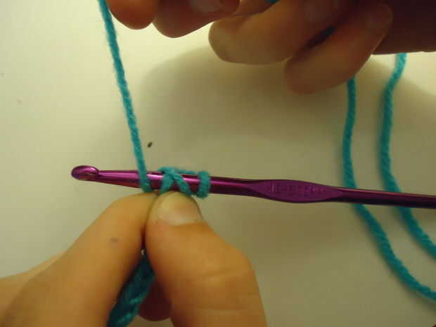 Envolver el hilo detrás del gancho de derecha a izquierda, al frente de ambos lazos. (En orden de izquierda a derecha: envuelto envuelto de hilo, lazo de cadena, hilo, lazo del extremo de la cadena)