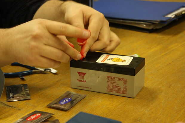 Nos encontramos con algunas baterías de célula de gel 12V nocturnas de Northackon Sugru construir. Pero sólo algunos tenían etiquetas de seguridad en el conector positivo. Ajá, un trabajo de Sugru!