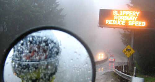 Espejos laterales- Utilizando espejos es esencial para tener un viaje seguro. Dicho esto, cuando empiezan a llegar mojado la visibilidad se reduce a cerca de 30%. Esto hace que cambia de carril y la preparación para el posterior movimiento amenazas mucho más difíciles que un paseo seco. Triple check antes de hacer una maniobra y gire su cabeza lejos sobre su hombro como visibilidad a través de su visor es probablemente más claro que los espejos.