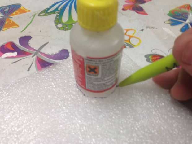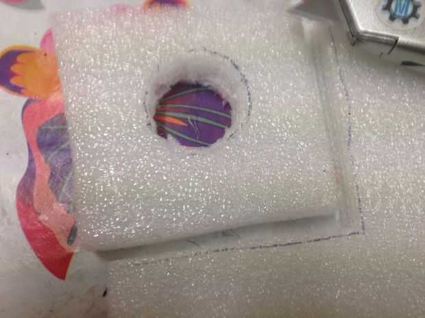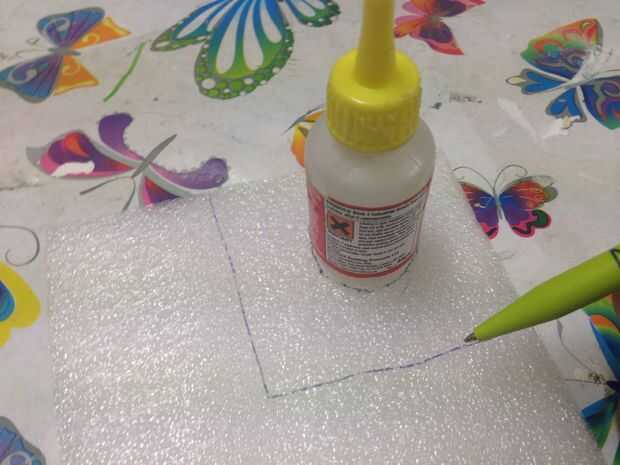 Así que corte un cuadrado de espuma y luego marca la parte inferior del envase de pegamento dibujo alrededor de la botella de pegamento. Entonces cuidadosamente utilicé el cuchillo para cortar un agujero, no tiene que ser bastante ya que la espuma se expandirá a agarre en la botella, que es un resultado deseado.
