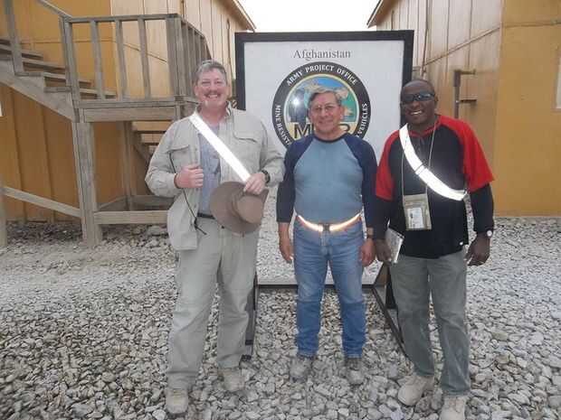 En la segunda ves me y dos de mis cohortes en usar correas reflectantes crimen (Rene y Larry). Esto es porque en bases militares uno de los mayores peligros es conseguir RUN OVER. 1 porque) vehículos blindados son difíciles de ver de, 2) a menudo el tono oscuro debido a peligros de fuego indirecto o francotirador, bases 3) muchos no tienen aceras y 4) todo el mundo camina a todas partes!