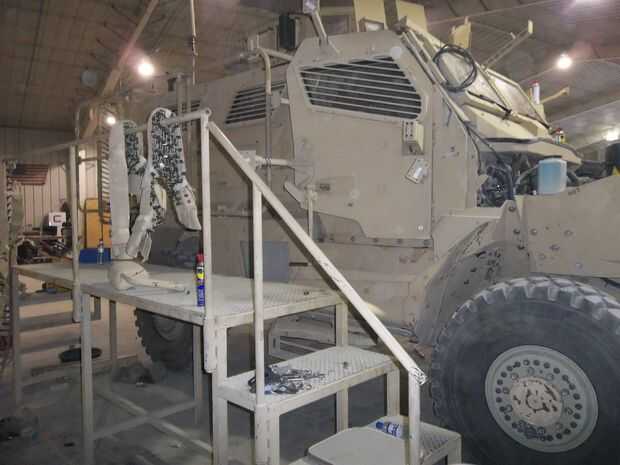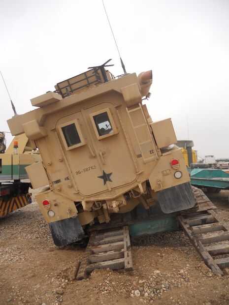 2) ¿vehículos militares hidráulica MUTILAN si no Asegúrese instalar y trabajar con ellos apropiadamente ven el MRAP con los pasos a su lado? Un trabajador estaba sentado en la plataforma y había instalado hacia abajo una pequeña parte. Así que cuando ella empuja el cierre de energía empuja hacia atrás la palanca y lastimar los diablos de su pierna.