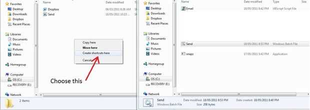 Para Send.bat para ejecutar en Inicio de sesión simplemente tienes que ponerlo en la carpeta "Inicio". Si estás en Windows 7, simplemente vaya a su menú de inicio, haga clic en "Todos los programas", vaya a "Inicio", haga clic en "Inicio", seleccione "Abrir" y utilizar el botón derecho del ratón para arrastrar las Send.bat en "Inicio". Debe aparecer una lista de opciones. Seleccione "Crear accesos directos aquí".