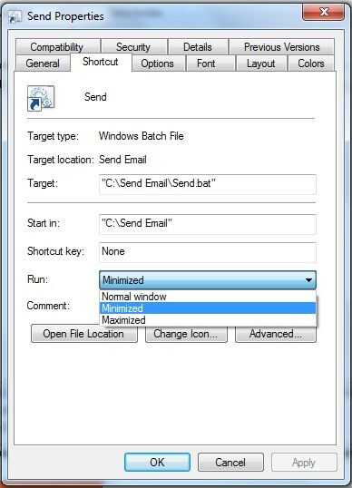 Al iniciar sesión, le dará la bienvenida con un cuadro de mensaje de comando que dice claramente "Enviar Email" y "Tomar foto". Si desea que esto sea un poco más discreto, se puede modificar lo que dice en el archivo Send.bat. También, usted puede conseguirlo para iniciar minimizado. Para ello, todo lo que tienes que hacer es clic derecho sobre el acceso directo, seleccione "Propiedades", en el clic de ficha "Acceso directo" en el menú desplegable marcado con "Run:" y seleccione "Minimizada". Al iniciar sesión, la ventana de comandos será minimizado y casi ni se nota como muy a menudo el símbolo del sistema windows que aparecen en Inicio de sesión. Debe cerrar la ventana una vez que el correo electrónico ha sido enviado y apenas dejará un rastro