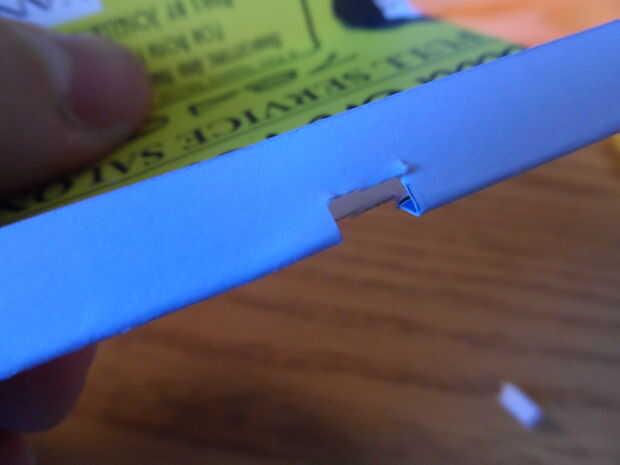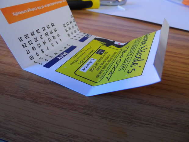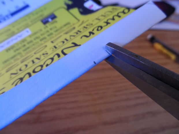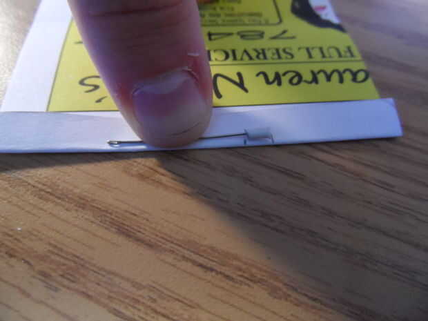Doble la cubierta en dos de las líneas que fueron elaboradas anteriormente por lo que será el tamaño de una tarjeta de crédito solo cuando está doblado en tres. Entonces, tome uno de los extremos cortos y dóblalo otra vez sólo un poco. La aguja se contenía en esta aleta corta. Sostenga la aguja en esta solapa, aproximadamente centrada y trace dos marcas pequeñas, una en cada extremo de la tapa de papel. Luego corte una muesca pequeña que está entre las marcas como en la imagen, pasando a través de ambas capas.