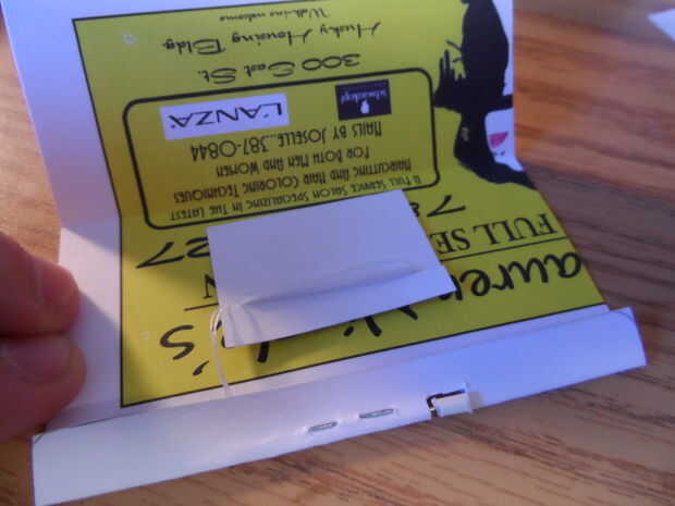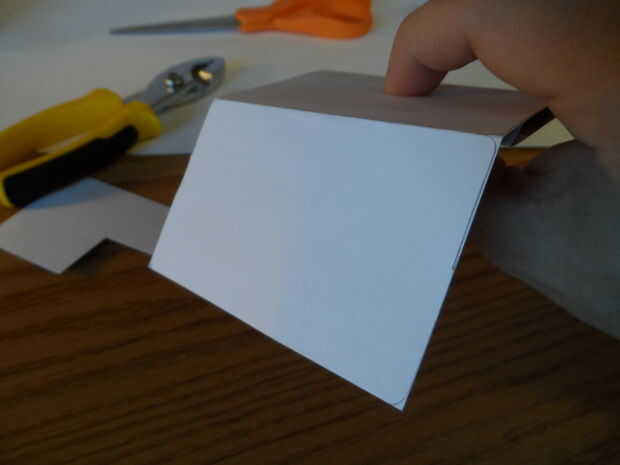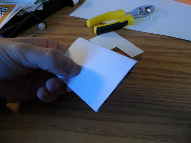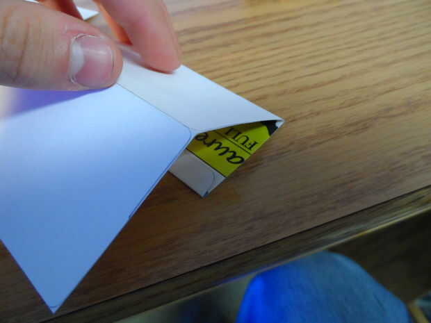 Si quieres escribir cualquier tipo de instrucciones para el uso interior, ahora es el tiempo. Luego, doble hacia arriba. Te recomiendo doblarlo lo que hago para asegurarse de que la bobina se queda en el interior, así que sabemos que es cuando nos de la grapa. Entonces, de la grapa a través de la cosa entera una vez, asegúrese de pasar por el extremo del papel de la bobina pero no el hilo, para mantener en su lugar. Una vez más, puedes apretar los extremos básicos abajo con unas pinzas para no rasgar su cartera o cualquier cosa en él. Probablemente desee escribir algo en el exterior, por lo que la gente sabe lo que es. Entonces pueden usar también, o al menos saben lo que es. Deslizarse en su bolsillo y estás listo para ir!