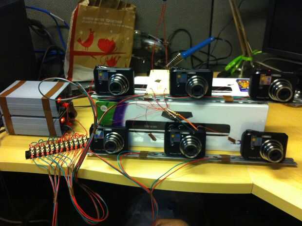 Bien, siguiente idea: comprar 6 cámaras digitales baratos-taco y conéctelos hasta un botón de disparo. Eso es todo! Simple y obvio!