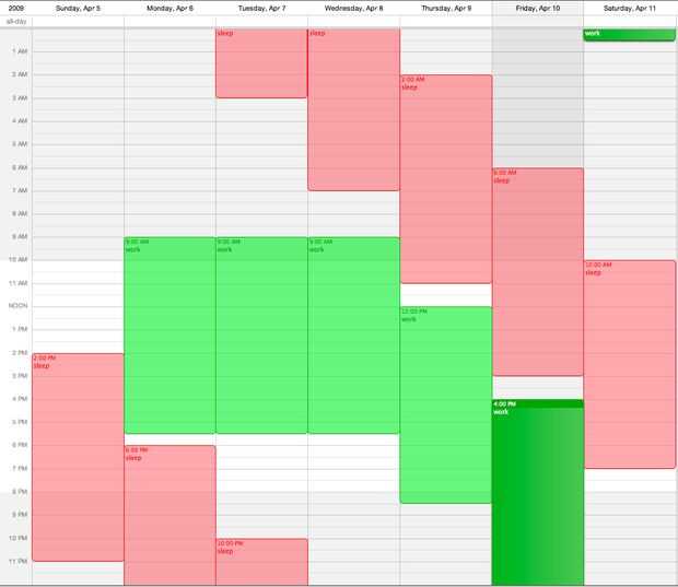 La imagen de abajo muestra el horario voy durmiendo y trabajando en. El rojo es cuando estoy programado para dormir y el verde cuando estoy programado para trabajar. Estoy comenzando este el miércoles, 1 de abril; o podría decirse que el jueves 2 de abril, como la 2:00 inicio del sueño es la más cercana a lo que pasa por normal para mí.