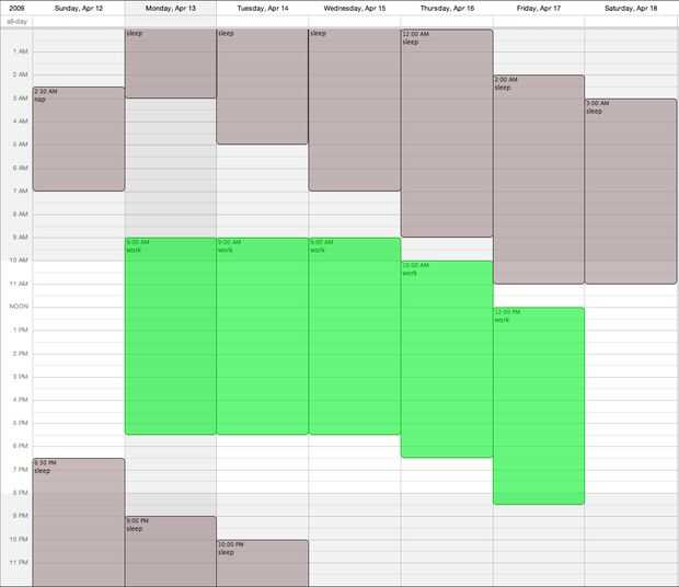 Los ajustes se muestran en cuadro de hoy, que no es de un PLAN sino de sueño que realmente dormí. Poco más difícil era el domingo, que según lo previsto y como dormía una corta noche de sueño y levantarse temprano, más probable es que no descansaba. Puesto que esto es lo que me sale a menudo durante la mayor parte de la semana, si puedo conseguir un día de no dormir, flojo y cansado, bajar de 4 o 5 días, voy a llamar a eso una victoria!