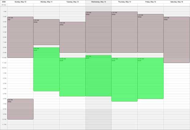 Drat. Pero revisa la semana pasada, por debajo. Es muy claro que mantener al día de 26 horas (no mencionar a un día de 28 horas) no es Natural para mí. Toma mucho trabajo, y fallan con frecuencia. Esto no es más fácil que de no mantenerse en un ciclo de 24 horas, que es básicamente lo que he vuelto a. Por lo tanto, estoy parando este experimento. Probablemente se venga con otro en algún momento pero no sé lo que es todavía. Quizás simplemente se trate de no tener ninguna programación en todo!