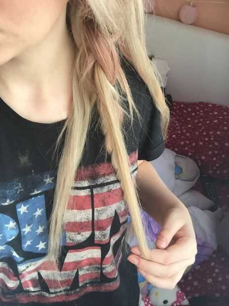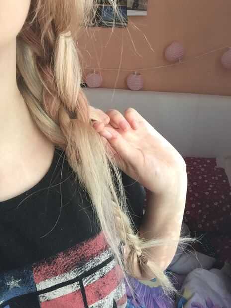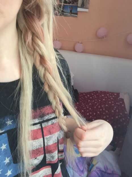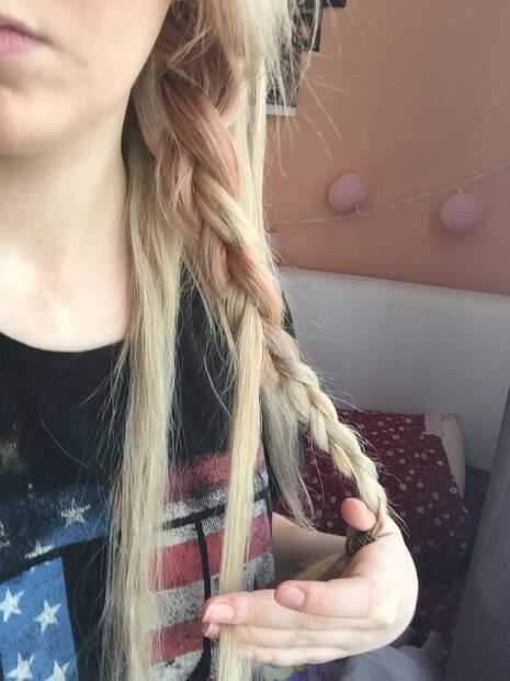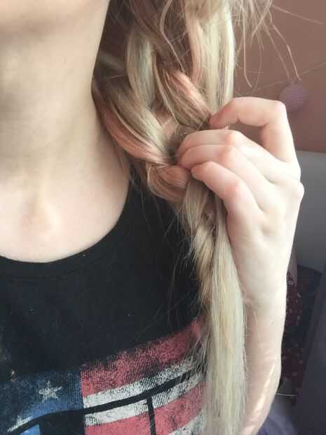 Tome el pedazo derecho de pelo y añadir a la derecha de la trenza y armadura hacia abajo. Desate el lazo del pelo de la trenza principal y añadir los extremos de las 3 secciones en uno.