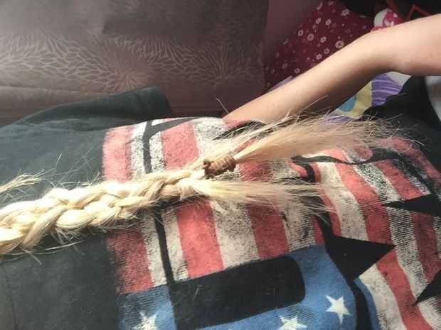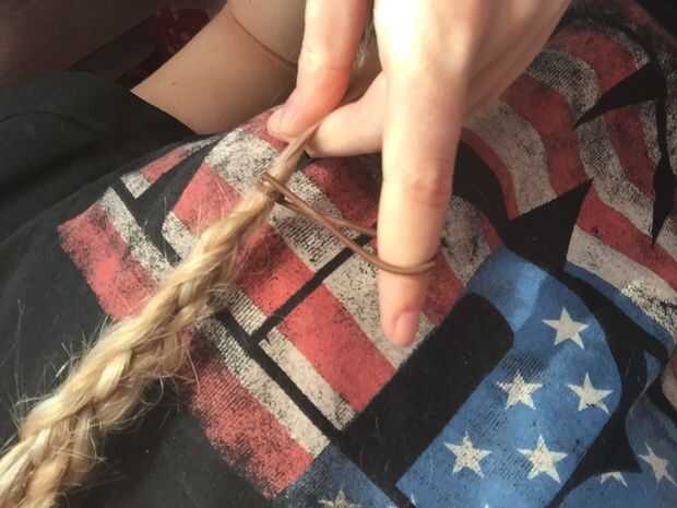 Tome este pedazo de pelo y tejido a través de varios orificios en la trenza por el pelo.