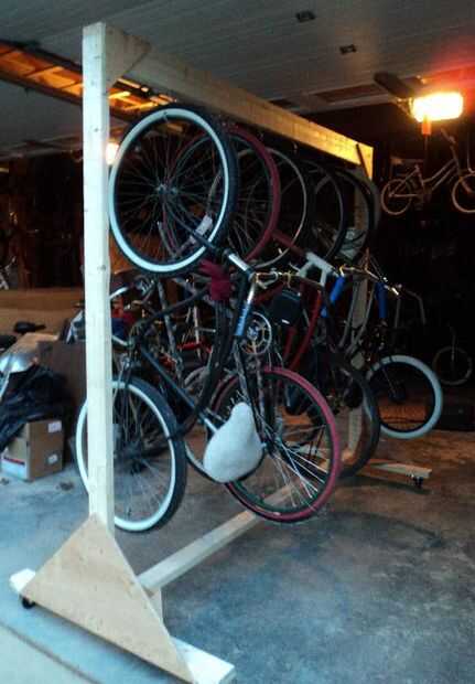 Eso es todo Coloque su bicicleta en el rack con los neumáticos delanteros arriba. Tres bicicletas a un lado y tres al otro lado. Usted puede colgar hacia abajo si es necesario. Cuando desea mover el estante de la bici solo agarras el extremo con las ruedas giratorias y dirigirlo todo.