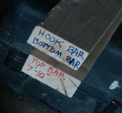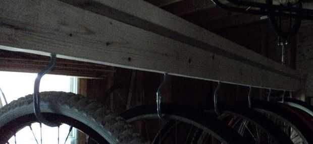 Hay 9 bicicletas ahora donde una vez hubo 6 bicicletas. Esto y el hecho de que algunas de las motos son de 30 a 50 años de edad pesan bastante. Hay un leve hundimiento en la barra superior y la barra de gancho que es normal para el peso. No tengo una preocupación de este momento, porque debe ser capaz de manejar el peso. Si aparece un signo de faliure puedo siempre pongo otro 2 X 4 costado de la barra de gancho de un hacer un doblador de la pareja por clavar o atornillar juntos y en la barra superior.