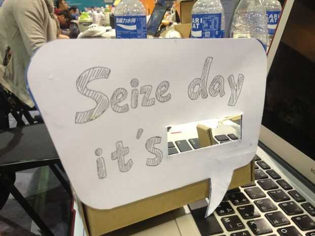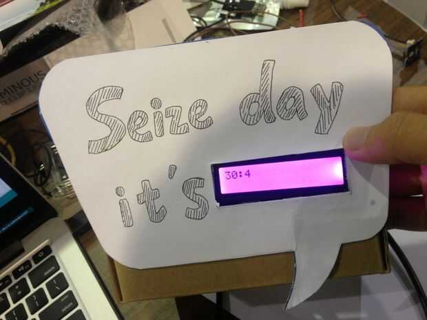 捏捏鬧鐘:不管是用手機鬧鐘或傳統鬧鐘, 大家一定都有過這樣的經驗:以為自己醒了按掉鬧鐘, 卻又不小心睡過頭的悲劇。 因此我們重新設計貪睡功能, 使用者必須緊握Seize Day才能持續貪睡, 一旦昏睡後鬆手, 過不久鬧鈴就會繼續叫。 唯一停止方法就是起身走到書桌, bǎ agarrar día 放回桌上的 Dock。