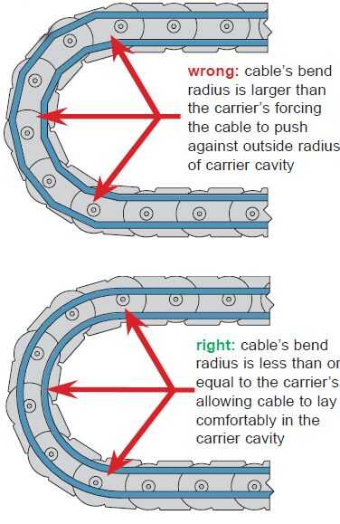 · Verificar que todos los cables y las mangueras no están instaladas demasiado apretado (estirado entre las barras de soporte) o demasiado floja (colgando en las barras de soporte) dentro del sistema portador al sujetar en su lugar. Objetivo óptimo, para el "eje neutro" (línea de centro del enlace) del sistema como se muestra a continuación.