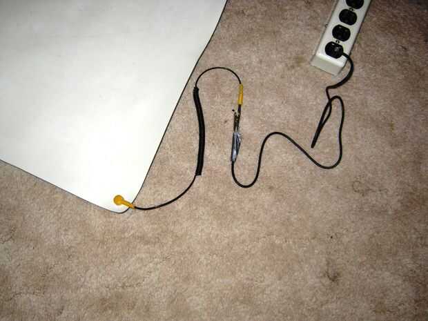 De procedimientos correctos de ESD, debe hacer todo su trabajo en una ESD mat (ver imagen) con la malla conectada a tierra. Esto significa que a una tubería metálica de agua o más comúnmente a la tierra en un enchufe de CA la correa de muñeca unida a la estera. (ver imagen)