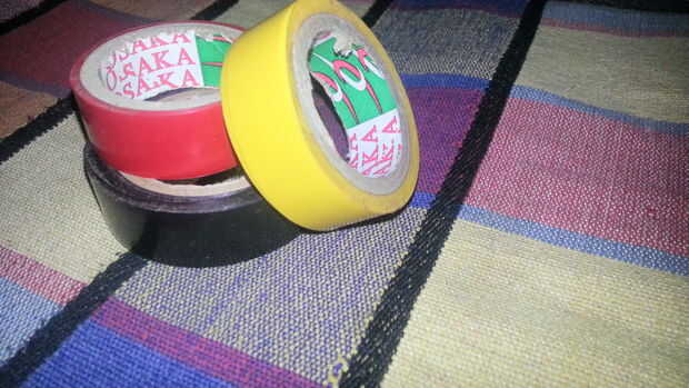 Necesitarás 3 colores diferentes (como bandera alemana contiene rojo, negro y amarillo) cintas del conducto, vuelva a llenar con pluma, caja móvil y tijera