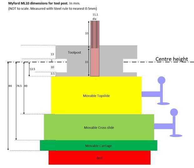La dimensión crítica es 13,5 mm! Esta es la distancia entre la cara superior de la corredera transversal y el eje del torno. 13,5 mm está bien si montar la herramienta de corte en la cara superior de la diapositiva cruzada (como en el poste de la herramienta de pie de elefante). En este caso, usted podría utilizar una herramienta tan grande como media pulgada (aproximadamente 12,5 mm) y necesitaría aproximadamente 1 mm de cuña por debajo de ella para llevar la punta de corte hasta la altura del centro. Normalmente en un torno pequeño como este, utilizas una herramienta de corte más pequeña (algunas mías son 5/16"(7,9 mm), otras son 3/8" (9.5 mm)) y empacar más alto mediante el uso de cuñas más.