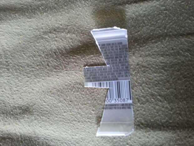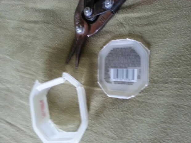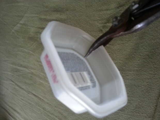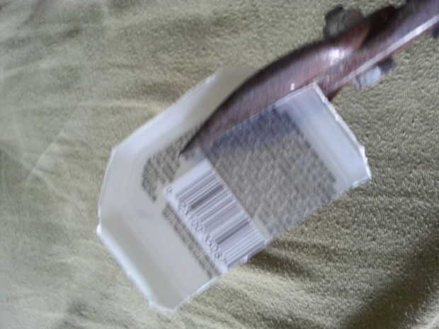 En primer lugar asegúrese de que cualquier plástico que utilizas esté limpia y seca. A continuación, utilice las tijeras para cortar un plástico sección plana grande. Cortar un rectángulo de aproximadamente 1 pulgada por 2 pulgadas de tamaño. Corte dos ranuras profundas de 7/8" en el lado largo, un 3/4" de al final la otra 1 1/4" del extremo. A continuación corte de los extremos hasta el final de la abertura en un ángulo de 70 grados a las rendijas. Hacer cortes paralelos a estos en la parte posterior de la hoja creando la forma en la última foto.