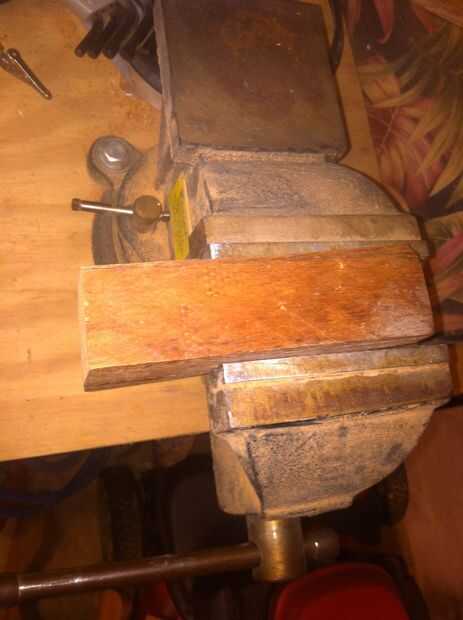 Obtener su madera (estoy utilizando una madera dura brasileña) y encontrar un área con un buen grano. Obtener su sierra caladora o sierra circular y corte un trozo más manejable. Entonces usted necesitará fijar en algún tipo de vice grip.
