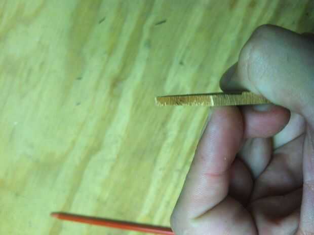 Ahora usted necesitará conseguir su sierra de mano y corte una tira delgada de madera de su parte. Una vez que se han cortado puede modelo guitarra escoge y traza su forma demasiado la madera (o hacer su propia forma completamente!).