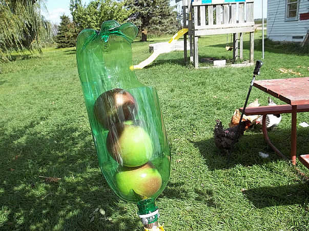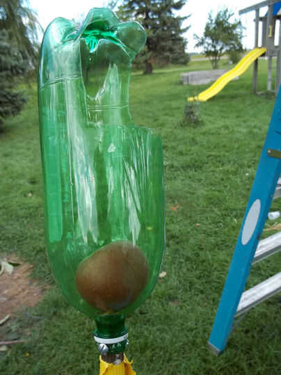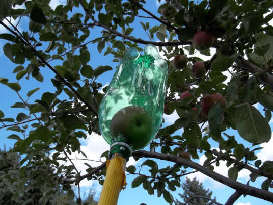 Con un vacío de 2 litros botella de refresco y un viejo mango de escoba o fregona, tienen un selector de apple. Mi mango pasó a ser de metal, así que tuve que taladrar agujeros en la botella de plástico y el palo de escoba. Corte mi abertura de la botella primero y que era bastante suave y luego la até al poste. Coloca la botella en el extremo del poste y perforó un agujero atravesando la botella y el polo. Había atornillado la botella en el poste y luego perforé 2 otros agujeros alrededor de la botella y el poste. Sujeta la botella firmemente al poste con tornillos.