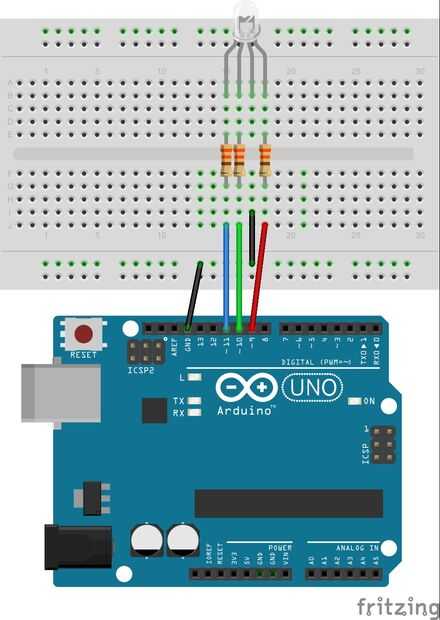 Para ver toda la gama color, nuestro LED debe ser conectada a los pines que permiten la modulación de anchura de pulso, por lo que tendremos que conectar el LED a los pines PWM (~). En este caso usaremos los pines 9 de led rojo, 10 verde y 11 para el azul.