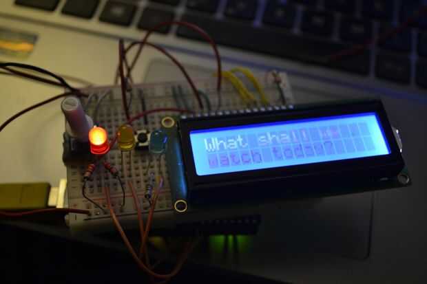 Este proyecto se basa en el proyecto de la bola de cristal encontrado en la guía que viene con el kit oficial Arduino, se puede ver un tutorial en vídeo de este proyecto con Arduino fundador, Massimo Banzi, aquí. Con el código para ese proyecto como punto de partida he creado un nuevo programa que genera un programa de televisión al azar (según sus entradas) y una temporada para ver.