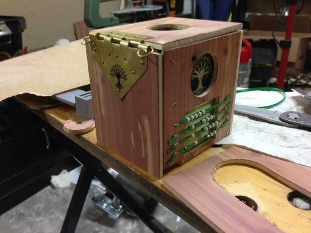 Para ensamblar todo, utilicé pegamento y clavos. Esto me permitió no tener que muchos se une a la abrazadera mientras el pegamento seca. Los clavos sostendrían la madera juntos. Usé clavos muy pequeños para mantener la madera de la división. También solía 2 tornillos en los lados superiores sujetan todo mejor debido a la tensión causada por la porción con bisagras. Hace muy simple la bisagra inferior. Está a sólo 2 clavos que se sobresalen de la madera. Luego hice bolsillos para los clavos perforando los agujeros en la capa media de los lados. La tapa es una bisagra de cobre amarillo, con alambre de cobre amarillo como el perno. Todos los elementos de latón son clavados solo en.