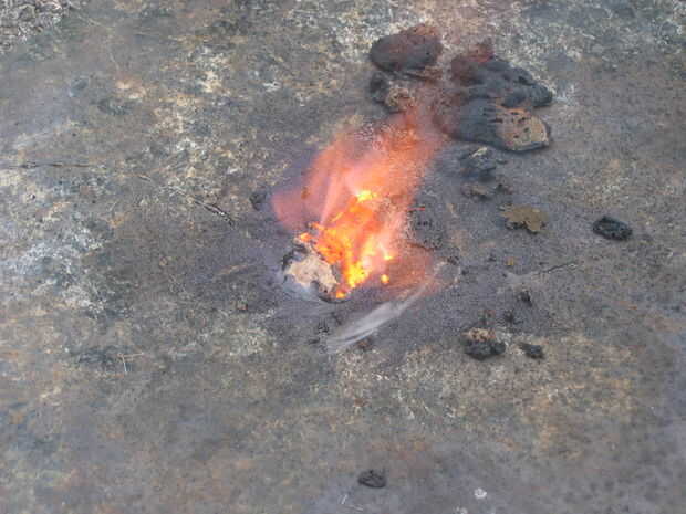-Se trata de una reacción de reducción/oxidación de combustión caliente. No chispa como una reacción de la termita, pero aún, no hagas algo tonto como ponerlo en una mesa de madera.
