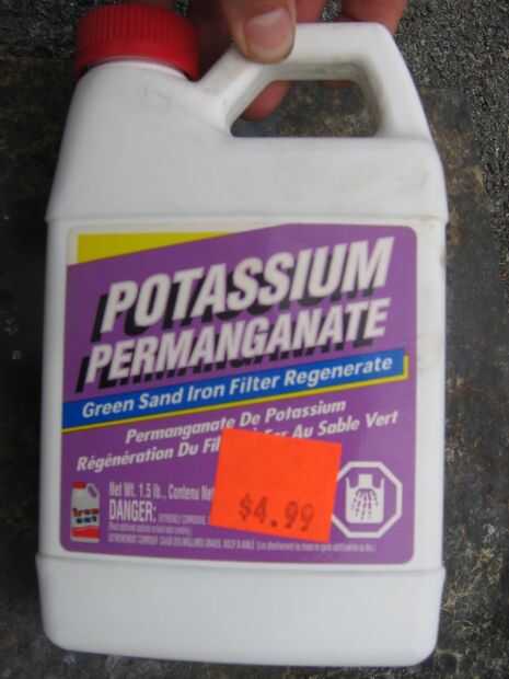 -Permanganato de potasio - esto se vende en las ferreterías pequeñas como Ace como filtro limpiador - $5
